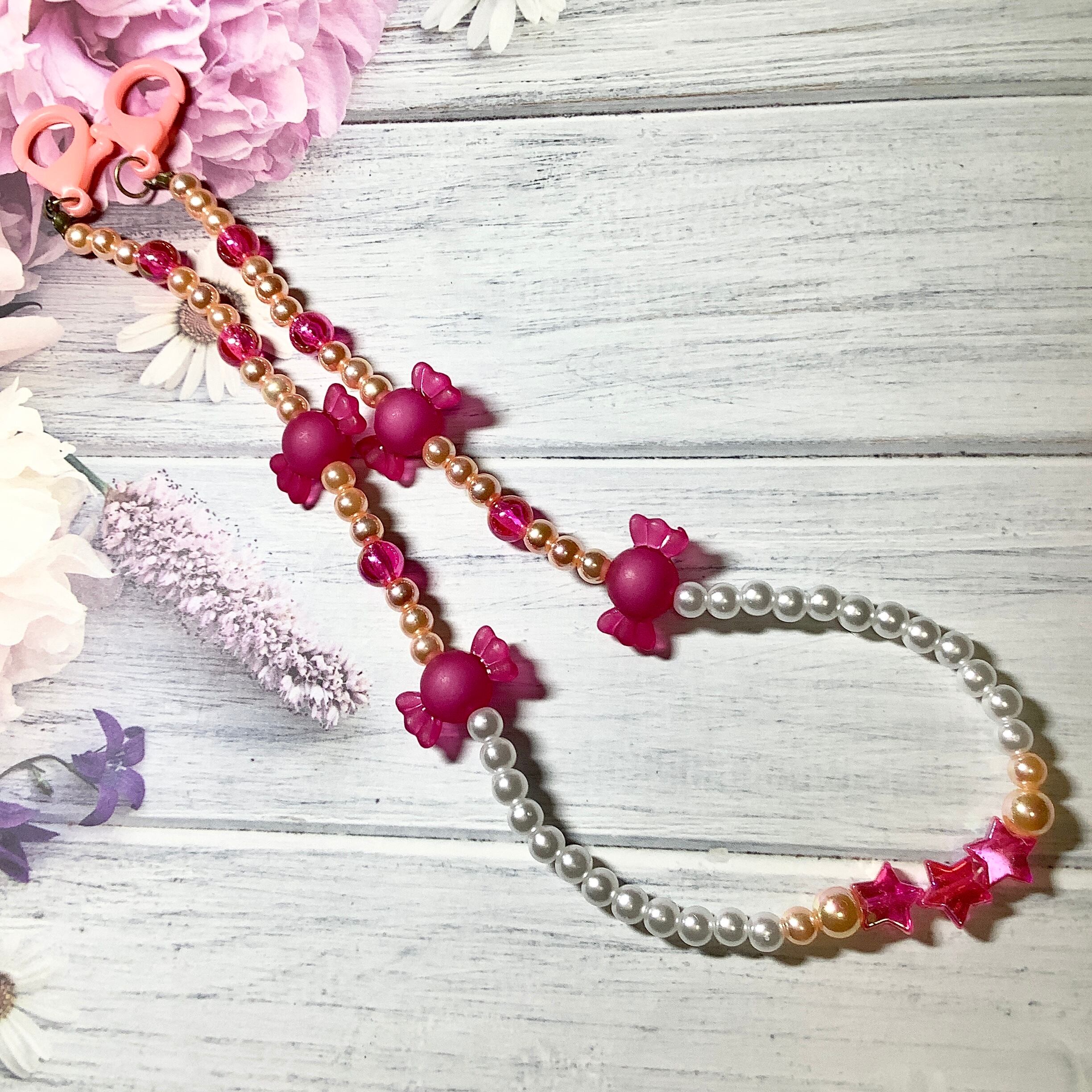 いつも作っている子供用マスクチェーンよりも、もうちょっと小さな子供さん用にマスクチェーン&ネックレスを作りました。