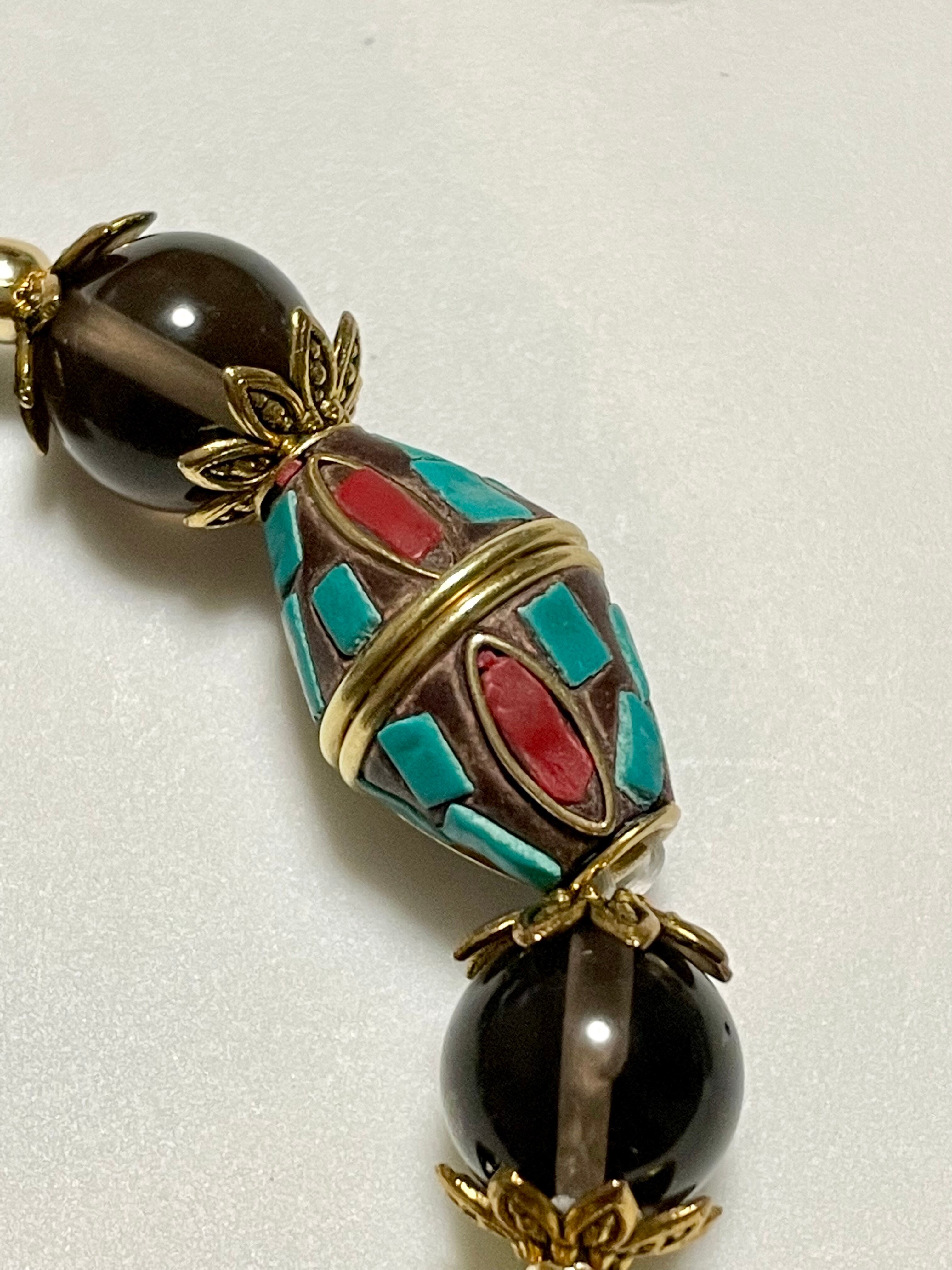 ネパールビーズの中でも一番人気のビーズを使い、24kgpの小さなラウンドのスチールビーズとスモーキークォーツを連ねて、エスニックブレスレットを作りました。